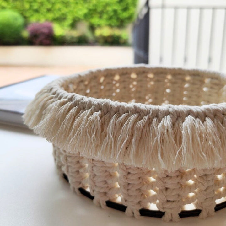 Add a touch of boho charm to your space with this beautifully handcrafted macramé basket. Woven from 100% natural cotton cord, this basket is perfect for organizing small essentials while also serving as a decorative piece. The unique design features intricate knots and a soft fringed rim, giving it a cozy, artisan feel.